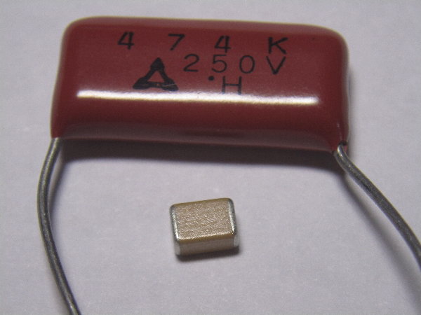 much smaller ceramic type capacitors might also work. Below is a photo showing